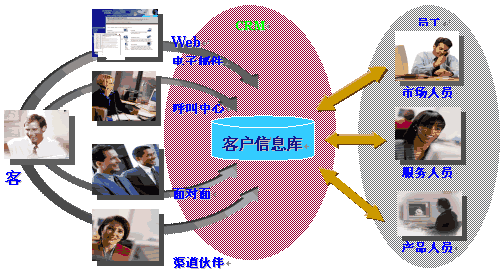 CRM是在90年代,隨著Internet的發(fā)展成熟起來。它充分利用了Internet技術(shù),通過電話中心、網(wǎng)站、電子郵件、移動(dòng)技術(shù)的使用,提供客戶多種形式的渠道,完成銷售、服務(wù)、市場(chǎng)等多種職能和流程,滿足客戶不同種類、不同層次的需求。這些渠道全方位地收集客戶信息,并通過集中的數(shù)據(jù)庫進(jìn)行管理和共享。而數(shù)據(jù)挖掘技術(shù)幫助企業(yè)進(jìn)一步分析客戶需求,提供決策支持。如下圖(資料來源:Siebel公司)。