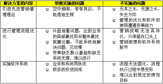 在CRM出現(xiàn)以前,企業(yè)為了解決市場(chǎng)、銷售和服務(wù)方面的問題,更好地吸引、獲得、保留和發(fā)展客戶,采取了各種方式,比如使用一套分銷管理的解決方案,或者請(qǐng)"點(diǎn)子公司"出謀劃策,或者尋求某個(gè)具體業(yè)務(wù)的優(yōu)化。以上這些做法往往只能完成局部的改進(jìn),或取得短期的效果,無法形成長(zhǎng)期和整體的競(jìng)爭(zhēng)優(yōu)勢(shì)。原因就在于這些解決方案都只提供了片面的、局部的解決方案,"頭痛醫(yī)頭,腳痛醫(yī)腳"不能綜合管理理念、業(yè)務(wù)流程和技術(shù)應(yīng)用這三個(gè)方面,系統(tǒng)地分析和解決問題。下表中分析了這些解決方案單獨(dú)實(shí)施或者不實(shí)施會(huì)帶來什么問題。