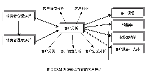 大多數(shù)CRM研究人員和應(yīng)用專家不認(rèn)為CRM存在作為應(yīng)用支撐的理論基礎(chǔ),充其量認(rèn)為CRM只是支持企業(yè)營銷的商業(yè)策略。隨著企業(yè)追求市場(chǎng)活動(dòng)績效的熱情的提高,企業(yè)開始采用定性和定量的分析方法決策其與市場(chǎng)和客戶有關(guān)的企業(yè)活動(dòng),如有效的客戶滿意度評(píng)價(jià)、客戶分類、客戶盈利率分析等。而這些決策迫切需要相關(guān)的理論基礎(chǔ)為指導(dǎo),真正擺脫靠經(jīng)驗(yàn)進(jìn)行決策的做法。當(dāng)前CRM的理論研究和學(xué)術(shù)探討并未真正走向體系化、統(tǒng)一化,所以造成CRM市場(chǎng)中提供的功能參差不齊。CRM系統(tǒng)必須存在一個(gè)完整的理論體系為指導(dǎo),本文將CRM系統(tǒng)賴以存在的理論基礎(chǔ)統(tǒng)稱為客戶理論(Theory on Customer)。