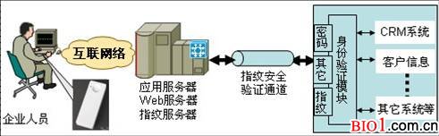 基于生物識別技術(shù)的CRM指紋身份認證系統(tǒng)應(yīng)用模式如下: