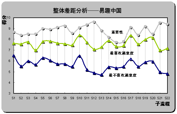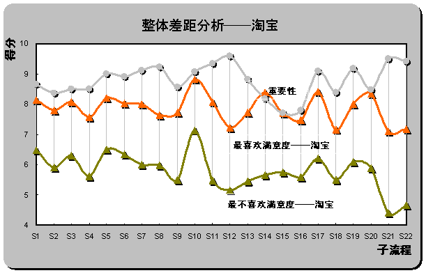 2) 重要流程欠缺最優(yōu)體驗。雖然易趣中國被認為是最不喜歡的在線銷售網(wǎng)站,但從滿意度評分也同時可以發(fā)現(xiàn),易趣中國在S1(瀏覽速度),S16(個人定制促銷信息的發(fā)布)和S15(個性化頁面設置)還是為用戶設計了相對較好的體驗。但重要性得分排名前三位的子流程中,S12(產品質量可靠)、S21(退換貨服務)和S22(客戶投訴和反饋)仍為重要性與滿意度差距最大的三個子流程,易趣中國也未在重要流程上為用戶設計優(yōu)越的在線體驗。
