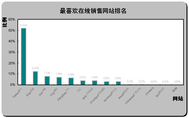 易趣中國和貝塔斯曼最不受歡迎。從最不喜歡在線銷售網(wǎng)站排名(如上圖)可以看出,易趣中國eBay
