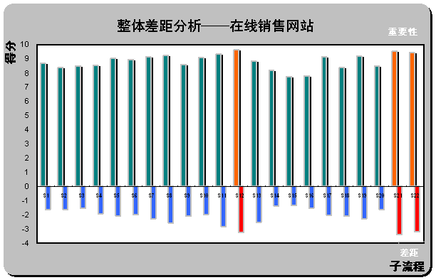 。2)整體差距分析(Gap Analysis)。請見上圖X軸下方所示,計算所有被調查對所列在線銷售網(wǎng)站的滿意度平均值(綜合最喜歡在線銷售網(wǎng)站和最不喜歡在線銷售網(wǎng)站的滿意度,計算被調查者對22個子流程的滿意度評分)。通過計算重要性和滿意度的差距,首先,一個有趣的現(xiàn)象,在著色的三個差距最大的子流程剛好也是重要性得分排名前三位的流程S12,