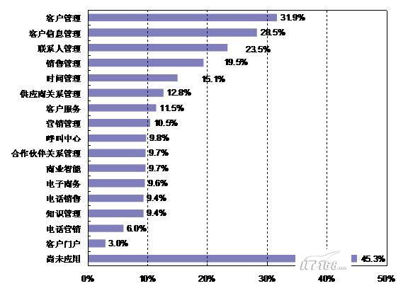 。。調(diào)查顯示,2007年有45.3%的企業(yè)還未應(yīng)用CRM信息化系統(tǒng)。在已經(jīng)應(yīng)用該系統(tǒng)的企業(yè)中,CRM系統(tǒng)應(yīng)用主要就是客戶管理,占到31.9%;其次是客戶信息管理和聯(lián)系人管理,這些應(yīng)用比例集中在23~31%之間;其他應(yīng)用還有銷售管理(19.5%)、時(shí)間管理(15.1%)、供應(yīng)商關(guān)系管理(12.8%)、客戶服務(wù)(11.5%)和營銷管理(10.5%)等,呼叫中心、合作伙伴關(guān)系管理、商業(yè)智能、電子商務(wù)、電話銷售、知識管理、電話營銷等比例均在10%以下。