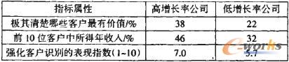 對《財(cái)富》雜志排名前l(fā)000位公司的200位經(jīng)理調(diào)查后得出結(jié)論,企業(yè)增長性與清楚的識別客戶有明顯的聯(lián)系(見表1)。該表反映了高增長率的企業(yè)比低增長率的企業(yè)更加懂得客戶識別的重要性,并運(yùn)用技巧來強(qiáng)化核心客戶為企業(yè)創(chuàng)造更多價(jià)值。
