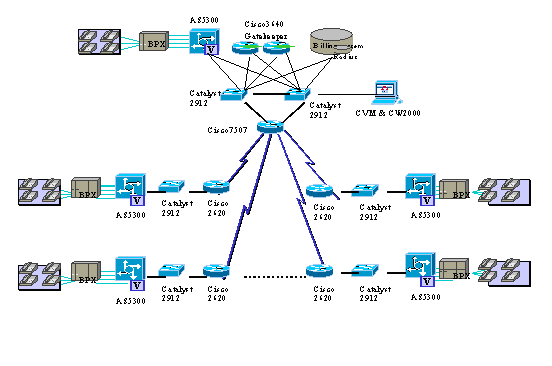 VoIP網(wǎng)關AS5300問世以來就可以支持兩個VoIP的中繼端口,在業(yè)界屬較高密度,而且99年年中就支持4個E1VoIP中繼端口。更主要的是AS5300具有Voice/Fax功能卡,能自動識別Voice和Fax,與Voice和Fax要采用不通的功能卡的產(chǎn)品相比,等于容量更是提高。這些技術(shù)特點為該試驗網(wǎng)工程的可擴展性提供了較高的起點。