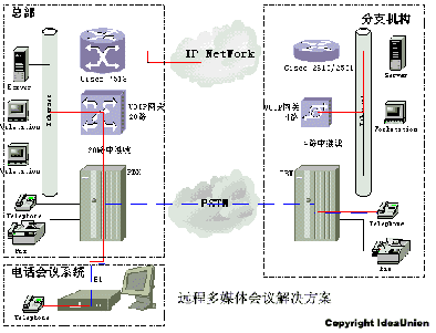 圖中紅色實線表示通過IP網(wǎng)絡(luò)傳輸語音的線路,藍色虛線表示通過PSTN傳輸語音的線路。由于通過IP網(wǎng)絡(luò)沒有使用額外的長途線路,所以降低了遠程會議系統(tǒng)的運行成本。同時VoIP傳輸系統(tǒng)支持普通的長途電話呼叫,為客戶節(jié)省長途電話開支。