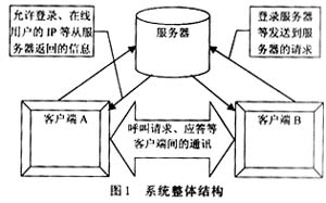 通過設(shè)置一個(gè)信令服務(wù)器的方式綜合以上兩種方式的優(yōu)缺點(diǎn)。用戶通話程序工作于半客戶機(jī)狀態(tài),信令服務(wù)器負(fù)責(zé)客戶的集中呼叫。當(dāng)某一個(gè)客戶呼叫,服務(wù)器負(fù)責(zé)中轉(zhuǎn)呼叫,當(dāng)被叫客戶響應(yīng)呼叫并應(yīng)答后,自主于呼叫方進(jìn)行通話而不必經(jīng)過信令服務(wù)器,這樣,大幅度地減少了服務(wù)器的數(shù)據(jù)量。有了集中的信令服務(wù)器,也便于客戶的管理,還可進(jìn)行廣播消息的發(fā)布。