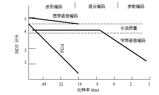 長(zhǎng)話質(zhì)量編碼器在比特率高于8Kbps時(shí)容易實(shí)現(xiàn),如圖4-2所示。長(zhǎng)話質(zhì)量的語音平均意見得分(MOS)必須在分或許分以上。傳統(tǒng)的PCN語音在比特率小于32