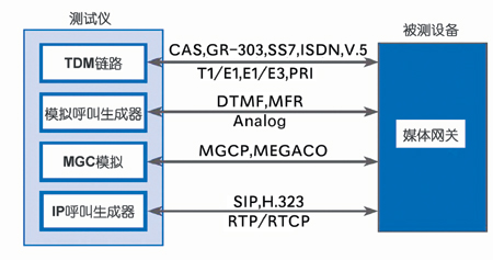 我們按照VoIP組網(wǎng)的原理,構(gòu)建了這樣一個基本網(wǎng)絡,其網(wǎng)絡結(jié)構(gòu)如圖4所示。我們用軟交換的概念來描述網(wǎng)絡上的設備,在這個網(wǎng)絡上,MG(媒體網(wǎng)關)和MGC(媒體網(wǎng)關控制器)是關鍵的VoIP網(wǎng)絡元素。這些網(wǎng)絡元素可以是支持H.323、MGCP、H.248或者SIP的實體。本文中提到的MG和MGC不具體指某一個設備,本次測試正是針對這兩類設備進行,測試的主要內(nèi)容也圍繞著這兩類設備展開。測試從模擬話音開始,然后延伸到PSTN網(wǎng)絡,再到IP網(wǎng)絡,最后回到模擬話機的被叫方。在這樣一個完整通話過程中,測試MG以及MGC的信令互操作性以及設備處理信令的能力。圖5是測試系統(tǒng)結(jié)構(gòu)原理圖。