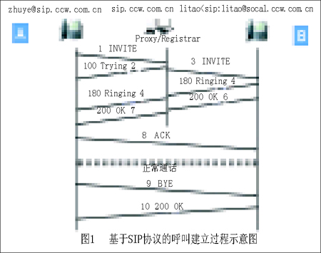 在Windows中內(nèi)置的NetMeeting就是典型的H.323協(xié)議客戶端,而比較常見的SIP系統(tǒng)是微軟開發(fā)的MSN Messenger系統(tǒng)。一個(gè)簡單的SIP協(xié)議呼叫建立過程如圖1所示。
