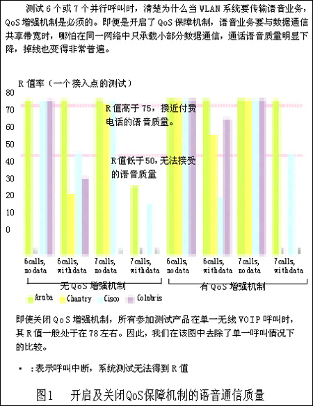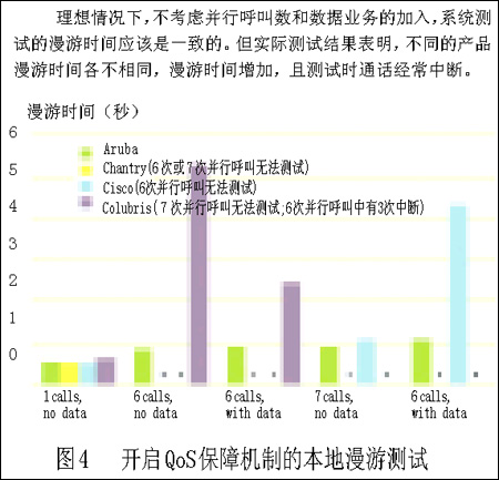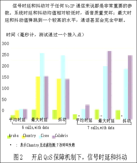 而當我們通過一個接入點或交換機傳送6到7個并行VoIP呼叫時,尤其是加入了數(shù)據(jù)通信業(yè)務后,所有產(chǎn)品的系統(tǒng)性能顯著降低。另外,當開通7個并行VoIP呼叫和關閉QoS保障機制時,即使沒有加入數(shù)據(jù)業(yè)務, Colubris設備也幾乎都處于通話中斷的狀態(tài)。因此,我們無法得到任何測試數(shù)據(jù)(如圖1所示)。