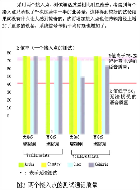 而其他供應商的設備在開啟QoS保障機制的情況下,一旦加入數(shù)據(jù)流業(yè)務,就很難保證通話質(zhì)量。從正面來看,在只有語音傳輸業(yè)務的情況下,QoS保障機制一般運行較好。當我們只承載語音傳輸時,所有系統(tǒng)的音頻質(zhì)量都改善了。在不加入數(shù)據(jù)流情況下測試6個或7個并行VoIP呼叫,所有的系統(tǒng)都能夠取得和付費電話一樣的通話質(zhì)量。但當我們加入數(shù)據(jù)流業(yè)務,一切都改變了。在承載6個并行VoIP呼叫并加入數(shù)據(jù)流業(yè)務的情況下,Colubris CN1250系統(tǒng)的R值衰落到70以下。根據(jù)ITU的R值標準,這說明一些用戶的通話質(zhì)量不令人滿意。Chanrty的R值在60左右,這個結果將不能令用戶滿意。除了客觀的R值評分以外,我們還進行了一些主觀的通信質(zhì)量監(jiān)聽,當加入了數(shù)據(jù)流業(yè)務以后,我們聽到了大量的回聲,掉線頻繁。總之,只要測試點加入數(shù)據(jù)業(yè)務流,上面描述的情況就會出現(xiàn),通話質(zhì)量通常變得惡劣。
