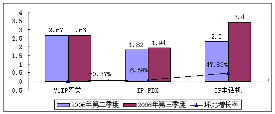 2006年國(guó)內(nèi)傳統(tǒng)電信運(yùn)營(yíng)商已經(jīng)逐步開(kāi)始進(jìn)入到NGN及新一代VoIP業(yè)務(wù)的實(shí)質(zhì)性網(wǎng)絡(luò)建設(shè)階段,并且隨著企業(yè)對(duì)VoIP理解的加深及控制成本的考慮,大型企業(yè)CIO對(duì)VoIP的接納態(tài)度正在向好。在中小型企業(yè)市場(chǎng),由于企業(yè)對(duì)通信成本更加敏感,但受VoIP設(shè)備技術(shù)成熟及價(jià)格下降這些因素的影響,這一市場(chǎng)也在迅速升溫。這些都促使VoIP設(shè)備在2006年開(kāi)始進(jìn)入實(shí)際購(gòu)買階段,促進(jìn)了VoIP設(shè)備規(guī)模增長(zhǎng)。2006年第二季度國(guó)內(nèi)VoIP設(shè)備市場(chǎng)收入為6.79 億人民幣,與第一季度同比增長(zhǎng)率為19.96%,整體市場(chǎng)保持穩(wěn)定增長(zhǎng)。從中國(guó)VoIP設(shè)備產(chǎn)品市場(chǎng)結(jié)構(gòu)(銷售額劃分)來(lái)看,VoIP網(wǎng)關(guān)占39.2%,IP-PBX占26.9%,IP電話機(jī)占33.9%。