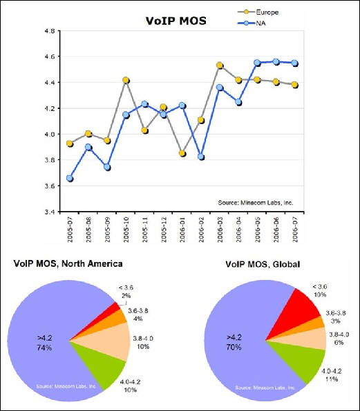 Minacom最新調(diào)研表明,一年來VoIP電話質(zhì)量和聯(lián)結(jié)速度都超過傳統(tǒng)標準公共開關(guān)電話。電話質(zhì)量得分Mean Opinion Score (MOS)數(shù)據(jù)表明,VoIP得分是4.2,而標準公共開關(guān)電話得分3.9。85%的IP電話質(zhì)量和穩(wěn)定性都超過標準公共開關(guān)電話。對電話聯(lián)結(jié)速度,VoIP的MOS得分是平均8.2秒,傳統(tǒng)電話時間更長,平均為8.9秒。這里的IP電話服務(wù)指商業(yè)企業(yè)級應(yīng)用,不是MSN,雅虎通之類免費IP電話個人應(yīng)用。比較而言,北美IP電話質(zhì)量優(yōu)于歐洲。