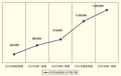 很快時(shí)代華納有線的VoIP業(yè)務(wù)就出現(xiàn)了強(qiáng)勁的增長(zhǎng),2005年的頭幾個(gè)月,其VoIP用戶數(shù)以幾乎每周1萬(wàn)的速度增加,到2005年第二季度,時(shí)代華納有線就成為全美第二大VoIP提供商。圖1描述了時(shí)代華納有線從2004年到2006年初的VoIP客戶強(qiáng)勁增長(zhǎng)。