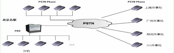 語音網(wǎng)絡:總部部署有小型PBX,同時擁有部分直線PSTN電話,辦事處直接使用直線PSTN電話。
