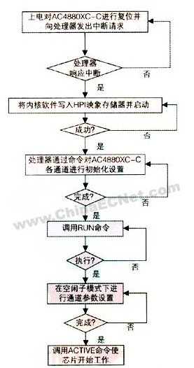主要是基于嵌入式arm處理器,通過(guò)hpi接口實(shí)現(xiàn)對(duì)ac4880xc-c及相關(guān)芯片的讀寫操作。流程圖如圖5所示: