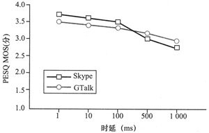 ms、100 ms時(shí)Skype的PESQ MOS高于GTalk,在時(shí)延為500 ms、1 000 ms時(shí)GTalk則略?xún)?yōu)于Skype。