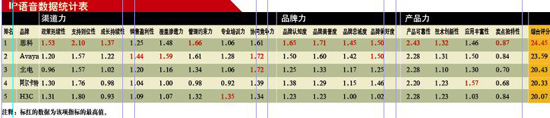 從綜合評分情況來看,思科、Avaya以明顯的優(yōu)勢位列IP語音產(chǎn)品的第一集團(tuán),他們的優(yōu)勢非常明顯,幾乎在所有指標(biāo)上都位居前列,而包括北電、阿爾卡特朗訊和H3C在內(nèi)的品牌位列第二集團(tuán)。