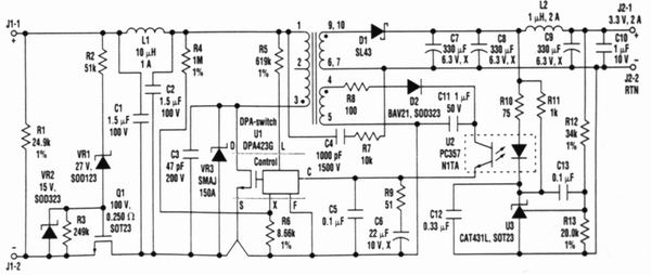 整個電源效率為78%,這樣1個簡單的反激電源能提供3.3V(2A)。對大多數(shù)應(yīng)用來講,低成本和簡單化是最重要的特性。假若采用同步整流正激轉(zhuǎn)換器拓撲和具有較低通導功耗、較高功率的器件DPA424G,則電路效率可增加5%~10%。