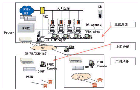 建設分布式呼叫中心系統(tǒng),從技術角度講,關鍵在于單點系統(tǒng)平臺、多點之間聯(lián)網和路由以及整個系統(tǒng)的統(tǒng)一管理三個方面。對于單點系統(tǒng)平臺的選擇,需要結構簡單、投資適中、易于建設,還需要采用開放式結構,以易于聯(lián)網、智能路由和統(tǒng)一管理;對于多點之間聯(lián)網,一般數據通過廣域網傳遞,語音可以通過公共電話網(市話網和長話網)傳遞,也可以采用VoIP技術與數據同在廣域網上傳遞;對于多點之間的智能路由和統(tǒng)一管理,物理上分布的多個系統(tǒng)完全可以看成邏輯上的一個系統(tǒng),利用專門的軟件實現統(tǒng)一管理和智能路由,包括呼叫前/后路由、智能呼叫溢出、坐席信息傳播、統(tǒng)一的實時狀態(tài)監(jiān)控和報表生成等,實現多個系統(tǒng)之間的負載均衡和災難備份。