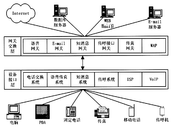 統(tǒng)一消息平臺集成了固定電話網(wǎng)、移動電話網(wǎng)和Internet網(wǎng)絡(luò)。目前,電話網(wǎng)和Internet網(wǎng)各自擁有獨(dú)立的網(wǎng)絡(luò)資源和信息服務(wù)領(lǐng)域,而這兩大網(wǎng)絡(luò)的用戶群存在著很大的交叉。電話的使用在中國已經(jīng)占有很高的普及率,傳統(tǒng)的160/168聲訊服務(wù)已經(jīng)成為中國百姓所熟悉的最具代表性的電話信息服務(wù),而Internet作為在中國剛剛興起的信息媒體,尚需要普通百姓逐漸認(rèn)識它、使用它。統(tǒng)一消息平臺將電話網(wǎng)和Internet網(wǎng)結(jié)合在一起,極大地擴(kuò)大了兩大網(wǎng)絡(luò)各自的用戶群,電話用戶可以用電話或者傳真獲取Internet上的信息,電子郵件服務(wù)也可以不局限于Internet,而能對廣大的電話用戶開放。統(tǒng)一消息平臺為用戶帶來的是信息的方便、及時,使人們在任何時間、任何地點(diǎn)都能夠獲取需要的信息。
