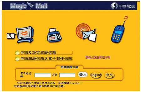 使用Internet瀏覽器的用戶可以通過(guò)中華電信超級(jí)信箱的專用網(wǎng)頁(yè)來(lái)接入。當(dāng)然,您需要輸入使用名和密碼。