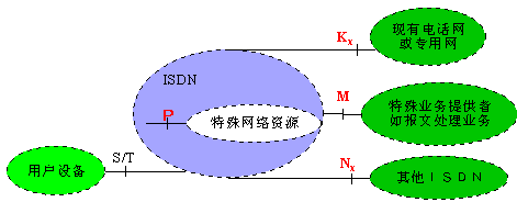 從現(xiàn)有的通信網過渡到未來的ISDN網,是長期的過程,這就必然存在ISDN網和現(xiàn)有通信網的互通問題。除了用戶設備接入ISDN的S/T參考點,ISDN定義了四個附加參考點用于網絡互聯(lián)。見下圖。