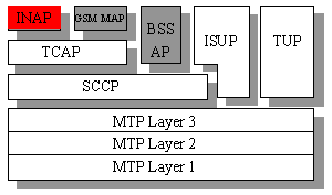智能網(wǎng)的通信采用SS7信令,SS7信令系統(tǒng)中的智能網(wǎng)應(yīng)用部分(INAP)是專門用于智能網(wǎng)通信的。INAP是建立在TCAP和SCCP協(xié)議層之上的,在下面SS7協(xié)議棧中可以看出INAP在SS7協(xié)議棧中所處的位置: