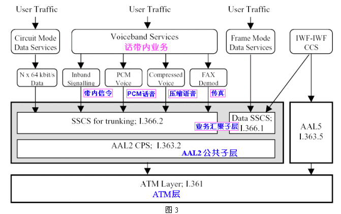 下圖3給出了VoATM的協(xié)議結(jié)構(gòu)模型(來源:AF-VMOA-0145-000:ATM論壇ATM Forum)。這是一個基于AAL2進行話帶話音及多媒體業(yè)務(wù)傳送的協(xié)議框架。在ATM論壇標(biāo)準(zhǔn)中,被稱為環(huán)路仿真業(yè)務(wù)(LES:Loop Emulation Service),和傳統(tǒng)PSTN不同的是采用很大新技術(shù)以充分利用傳送帶寬: