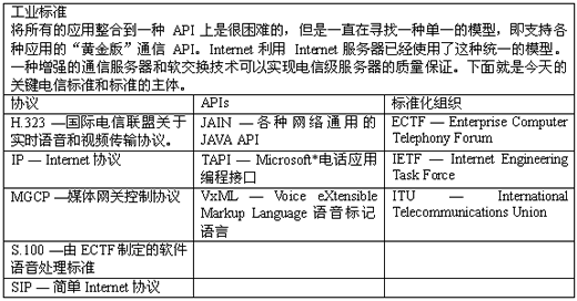 如今我們可以看到這種趨勢的例子。新一代的有競爭力的業(yè)務提供商正在利用在綜合網絡中像語音門戶,統(tǒng)一消息,和v_Business這些領域中涌現(xiàn)出來的機會。這些業(yè)務提供商還用像個人助理,Internet會議,以及Internet呼叫等待這樣一些耳熟能詳?shù)膽迷贗nternet上推出了下一代服務。