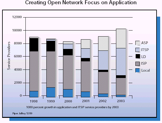 關于新的業(yè)務提供商的前景,ASP是最為熱門的,由于整個行業(yè)的外購趨勢,使得它吸引了數(shù)目巨大的風險債券和投資。但是如果說他們只是關注外購那就太籠統(tǒng)了。事實上一些公司是以托管為中心的,一些是以連通性為中心的,還有一些是以應用為中心的。