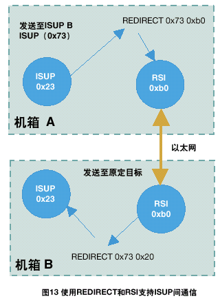 例如,一個雙ISUP系統(tǒng)應該由兩個ISUP部分組成,每部分缺省module_id都為0x23。A方ISUP的配置數(shù)據(jù)表示另一個ISUP部分的module_id為0x73;因此,在A方將會有一個重定向的動作來對經(jīng)過RSI發(fā)送往0x73的任何訊息重新定向。在B方,應該有一個REDIRECT語句將B方RSI所接收的所有目標為0x73的訊息路由到本地ISUP,標識為0x23。具體情況如圖13所示。