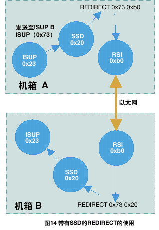 運行在信令卡上的協(xié)議模塊,接收端(對方)的REDIRECT語句應該通過ssd或ssds驅動(通常情況下module_id為0x20)來對訊息進行重定向,如圖14所示。