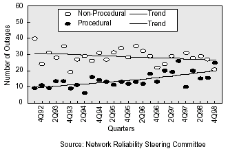 根據(jù)來(lái)自網(wǎng)絡(luò)可靠性指導(dǎo)委員會(huì)(NRSC)的研究,對(duì)于33%報(bào)告的業(yè)務(wù)中斷,程序出錯(cuò)是根本原因。程序中斷的頻率有上升的趨勢(shì),正如在右面圖中顯示的那樣。