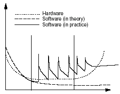 通常,硬件遵循所謂"浴缸曲線"--故障率在系統(tǒng)投入使用的前幾個(gè)月降低,但是在一定時(shí)間后再一次增加。最初的降低是因?yàn)?quot;強(qiáng)化試驗(yàn)",較差的組件失效的相對(duì)較快,而被去除掉。較穩(wěn)定的組件在系統(tǒng)中保留下來(lái)。一段時(shí)間后,它們開(kāi)始變差,最終失效。硬件行為在下面的圖中由點(diǎn)線表示。