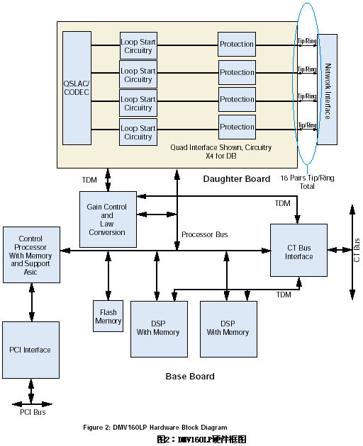 從連接到DMV160LP板卡的16條環(huán)路電話(huà)線上來(lái)的信號(hào)首先要通過(guò)電話(huà)線接口,該接口可以提供對(duì)瞬間電流的保護(hù)以及對(duì)電磁干擾的抑制。這些電話(huà)線接口使用了可靠的晶體開(kāi)關(guān)(沒(méi)有機(jī)械連接)和FCC-Part