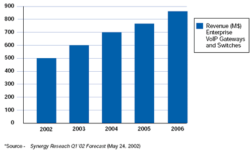 然后, Synergy也預(yù)測(cè)VoIP網(wǎng)關(guān)和交換應(yīng)用從2002年到2006年每年會(huì)有34.6%的增長(zhǎng). 需要產(chǎn)品來(lái)把傳統(tǒng)電話交換網(wǎng)絡(luò)和IP網(wǎng)絡(luò)橋接起來(lái).