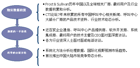 Frost & Sullivan 和 CTI論壇(m.dldsrs.com)共同組成的調(diào)研小組,在查閱了大量資料的基礎(chǔ)之上,以企業(yè)通信及呼叫中心的設(shè)備應(yīng)用、投資計劃以及相關(guān)廠商的市場表現(xiàn)為出發(fā)點,通過對企業(yè)通信及呼叫中心重要應(yīng)用企業(yè)、在市場占主導(dǎo)地位的二十多家設(shè)備廠商、二十多家軟件開發(fā)商、十幾家系統(tǒng)集成商、數(shù)家外包運(yùn)營商的深度訪談,參閱內(nèi)部相關(guān)報告及數(shù)據(jù)庫,對數(shù)據(jù)的來源和數(shù)據(jù)的準(zhǔn)確性進(jìn)行了詳細(xì)核對與論證;憑借參與調(diào)研人員的多年從業(yè)經(jīng)